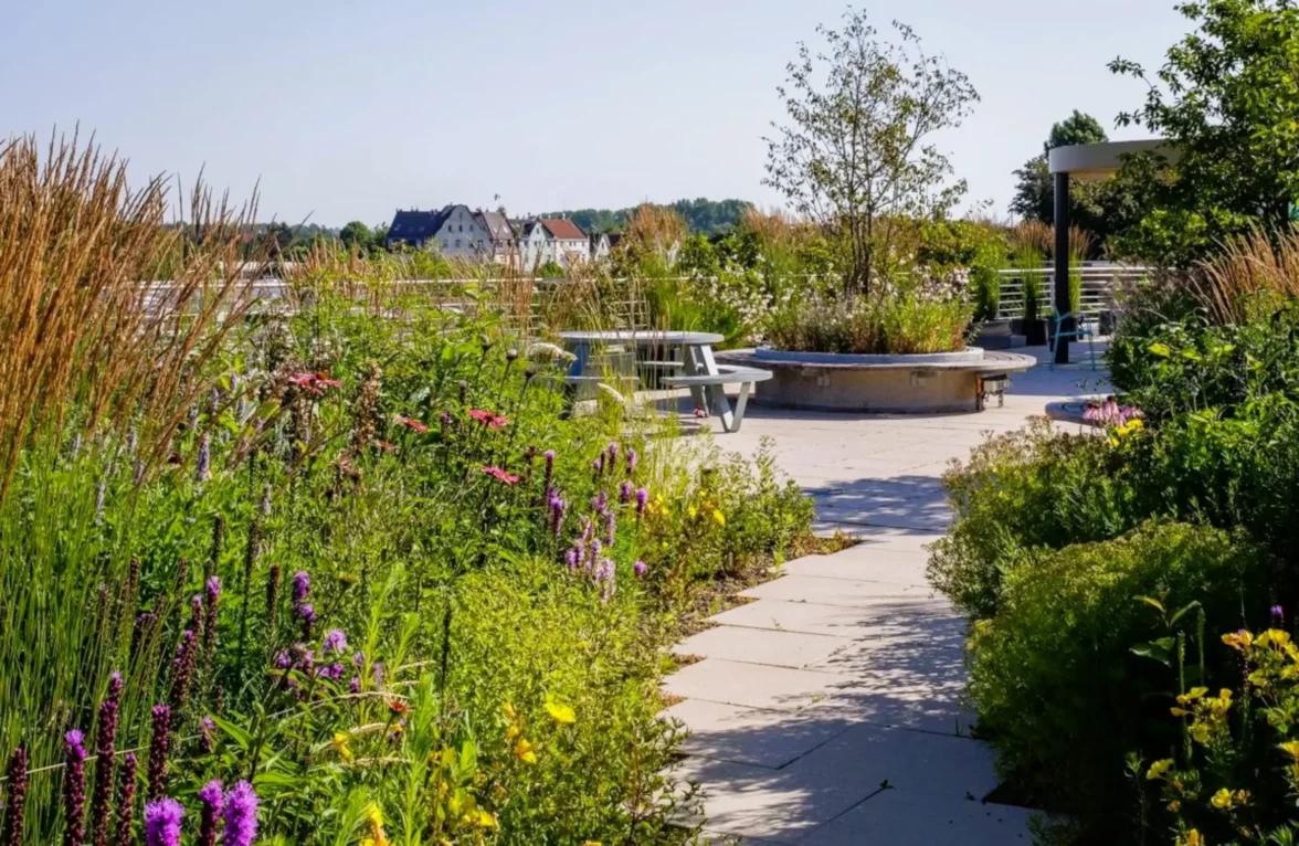 The planting concept is based on robust Mediterranean plants such as oleaster (wild olive), ornamental onion, sedum, Virginia creeper, and evergreen honeysuckle, and provides habitat for many native bee and butterfly species.