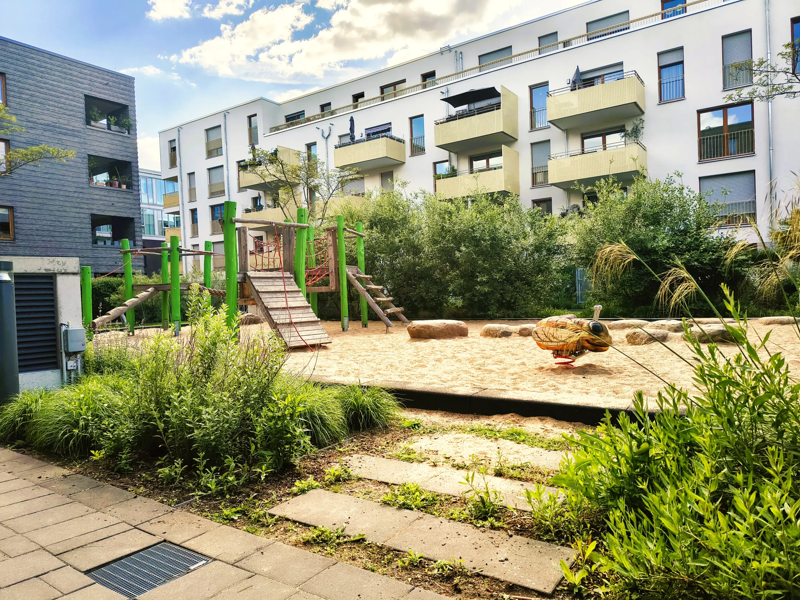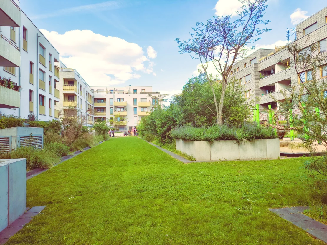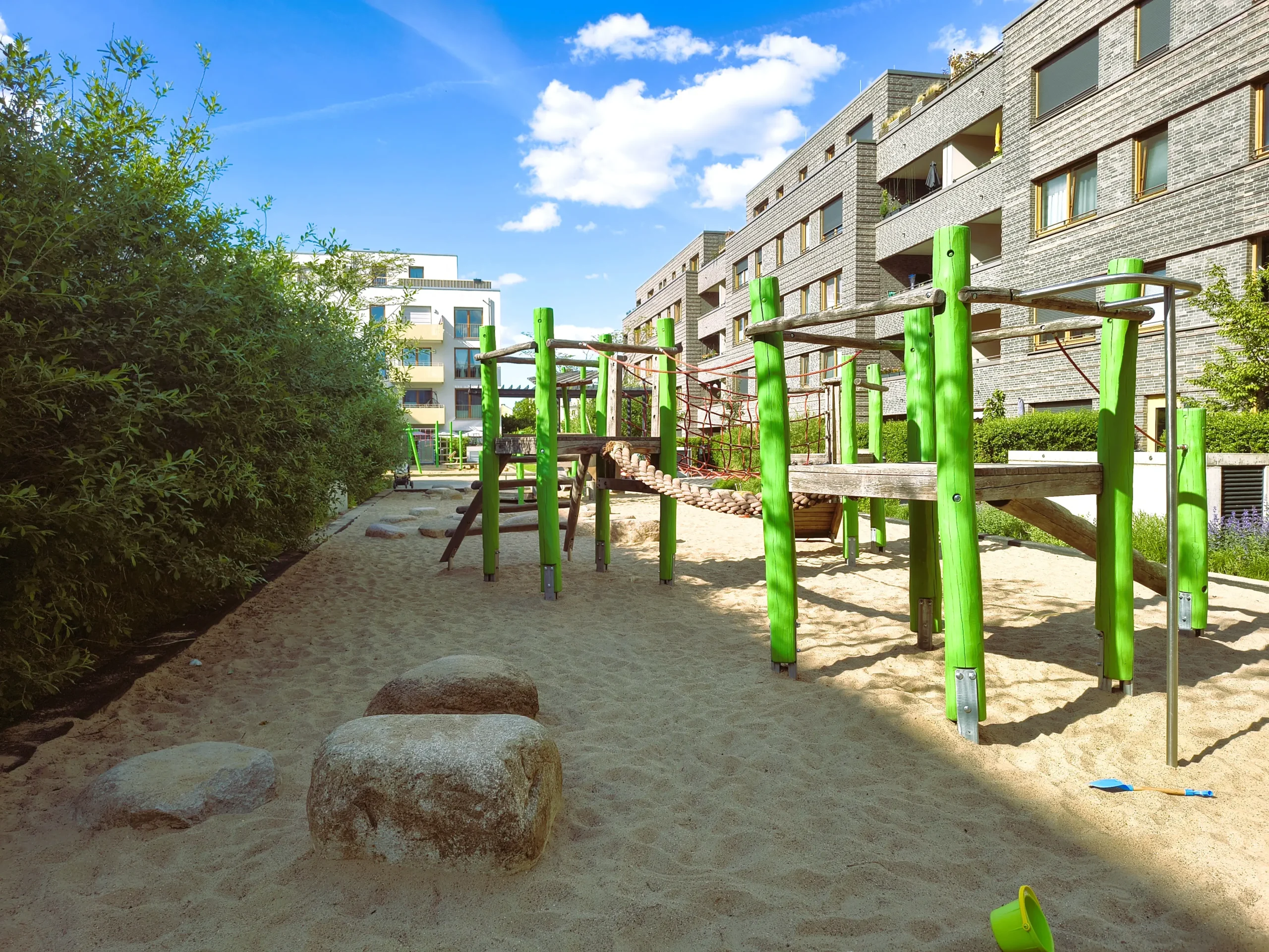 Eine Kernaufgabe für die Planung ist die Außenanlagen des Quartiers als ein attraktiver Raum für alle Altersgruppen zu gestalten, wo der Freiraum in einem Rückzugsort für Entspannung und Spielen ins Grüne direkt vor der Wohnung transformiert wird.