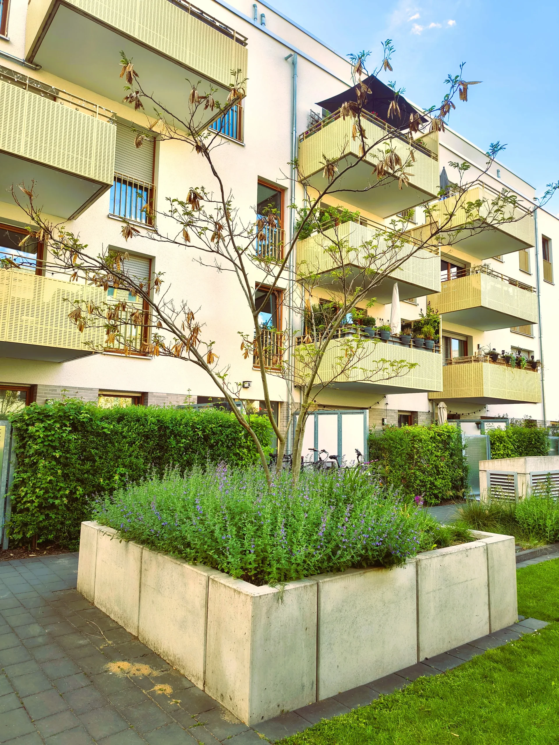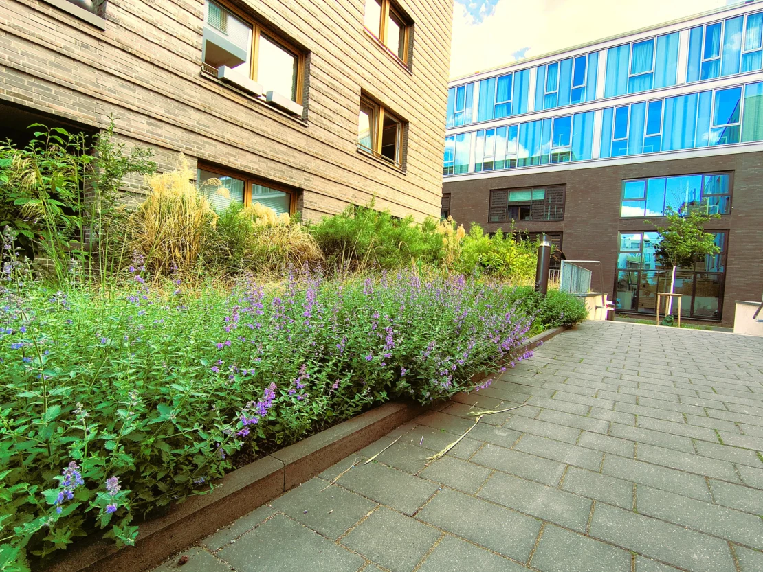 Ein großer Wunsch des Auftraggebers war die Pflegekosten für die Außenanlagen möglichst gering zu halten und solche Pflanzen auszuwählen, die mit den heißen Sommertagen in Köln zu recht kommen würden.