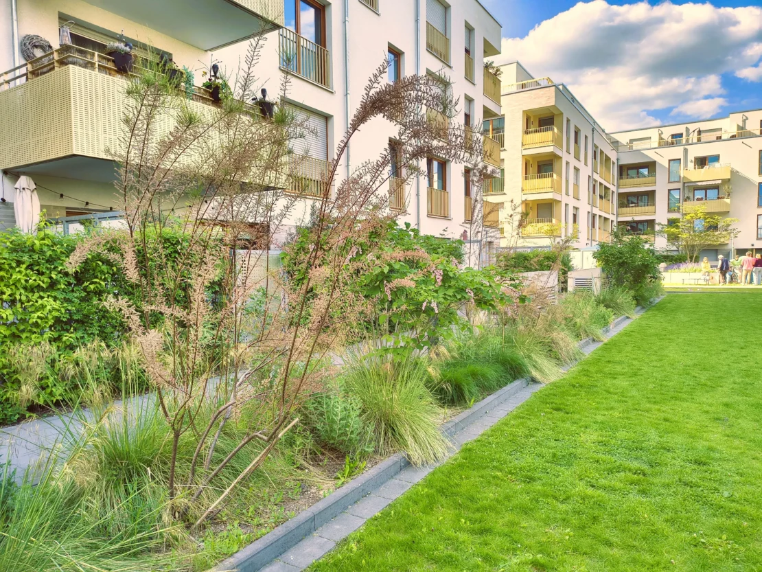 Die Außenanlagen sind mit viel Raum für gemeinschaftliche Nutzung gestaltet und