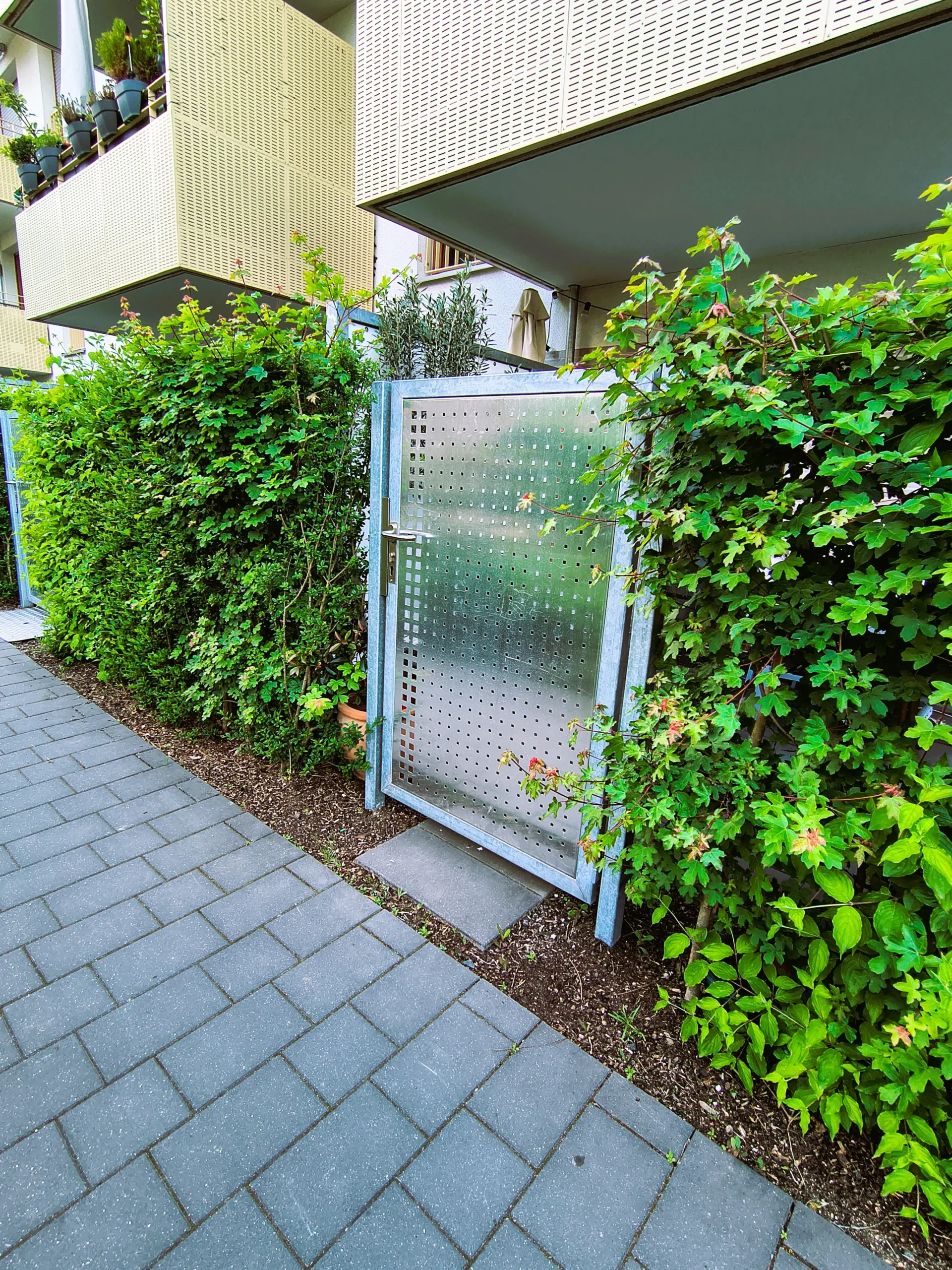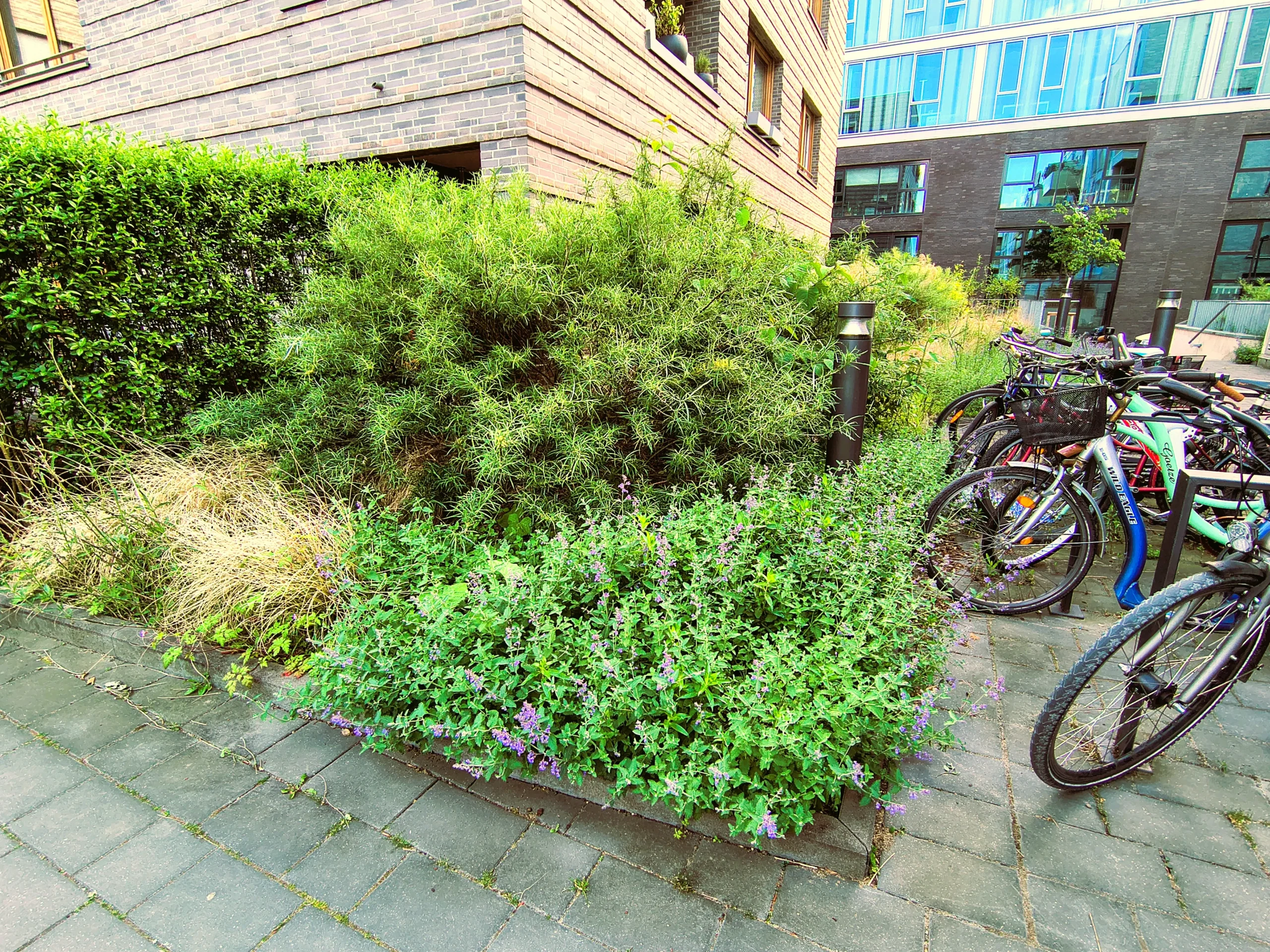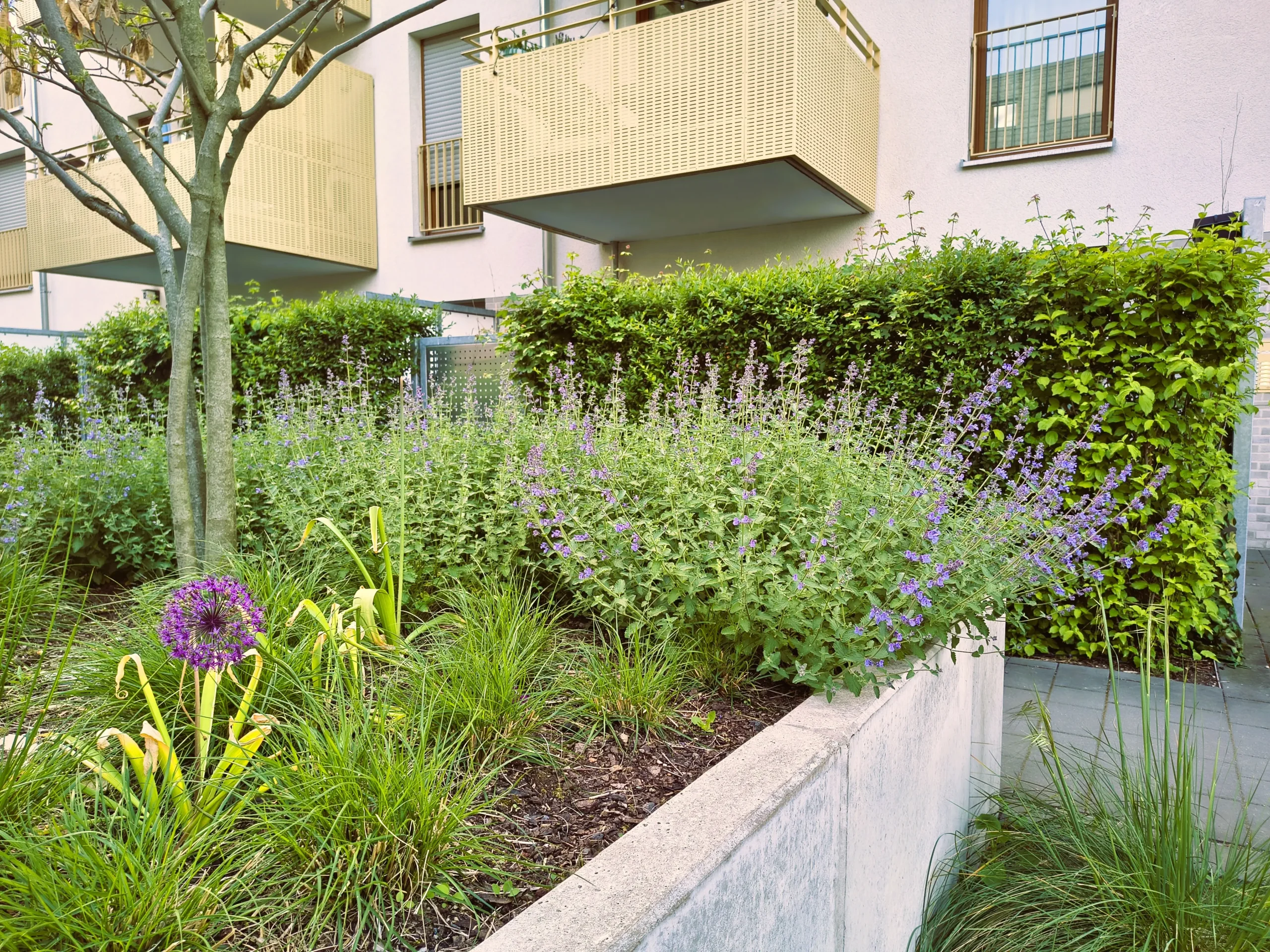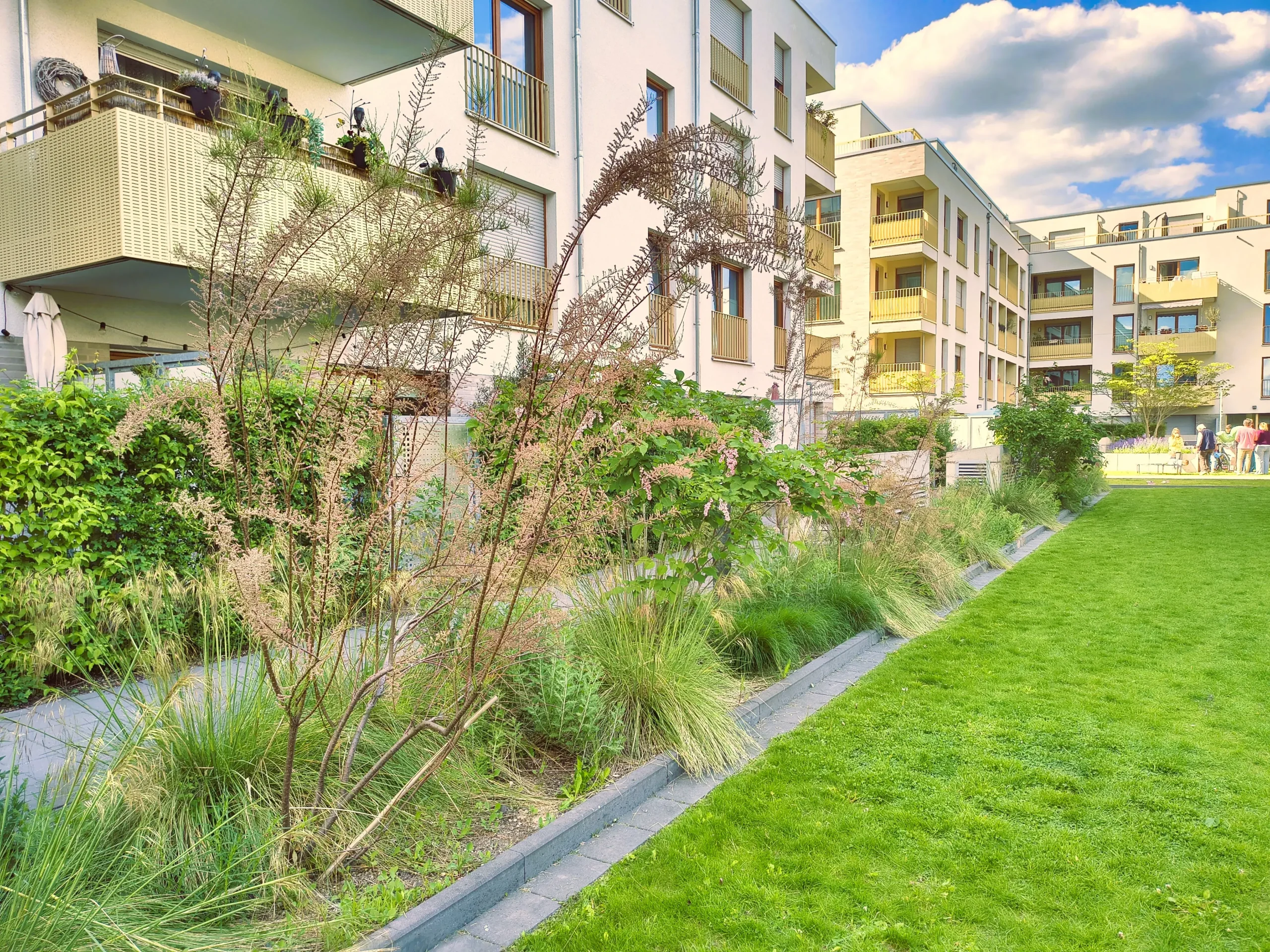 Die Bepflanzung ist besonders für die wechselnden Klimafaktoren ausgewählt und inkludiert Klima-resiliente Bäume, Trockenheitsresistente Staudenbeete und immergrüne Bodendecker. Die Privatgärten haben ein direkter Zugang zum Innenhof und niedrigen Hecken schaffen der notwendigen Sichtschutz zwischen Wohnung und gemeinschaftlicher Grünraum, und gleichzeitig dienen als Winterfutter für vielen heimischen Vogelarten.