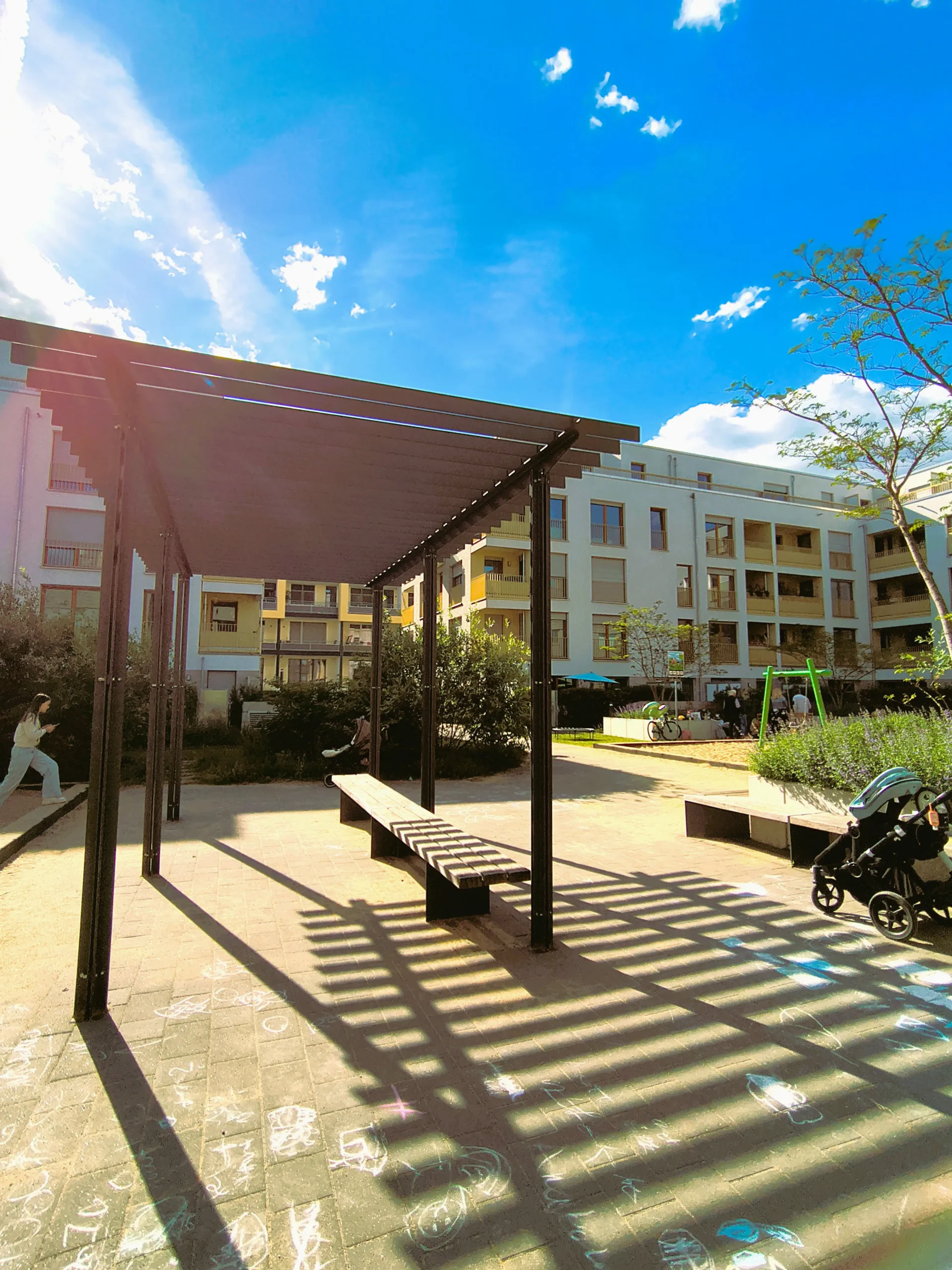 sind in Bereichen unterteilt worden – der Spielplatz bieten inklusives Spielen für Kinder in unterschiedlichen Altersgruppen an, eine breite Wiese lädt zum Picknick ein und eine große Pergola und zahlreichen Sitzbänken werden das Lieblingstreffpunkt zum Quatschen und zum Entspannen.