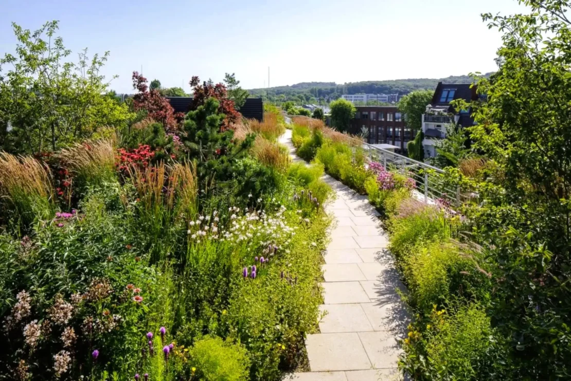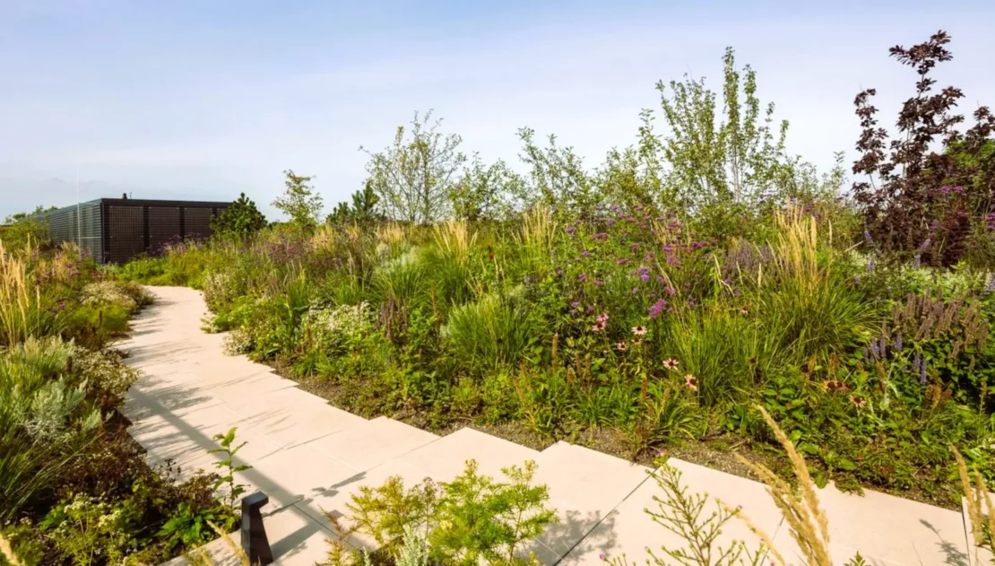 Die Dachbegrünung mit einer Gesamtfläche von ca. 1.300 m2, die mit einem intensiven Gründach-Systemaufbau geplant ist, bietet ausreichend Platz für Meetings, Pausen und mobile Arbeitsplätze. Der Dachgarten ist mit prärie-ähnlichen Stauden, Sträuchern und immergrünen Gehölzen gestaltet. Im Laufe der Planung sollten auch die statischen Lasten für die Gehölze und die modellierte Hügellandschaft in enger Zusammenarbeit mit dem Statiker und mit dem Architekten überprüft werden. Der Terrassenbereich bekommt eine grüne Sichtschutz durch die schönen Felsenbirnen, kleinere Gräser (Pennisetum ‘Hameln’) und Stauden-Gruppen, die in zusätzlichen Pflanzgefäßen ergänzt sind.