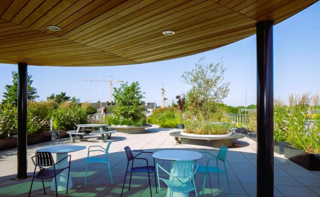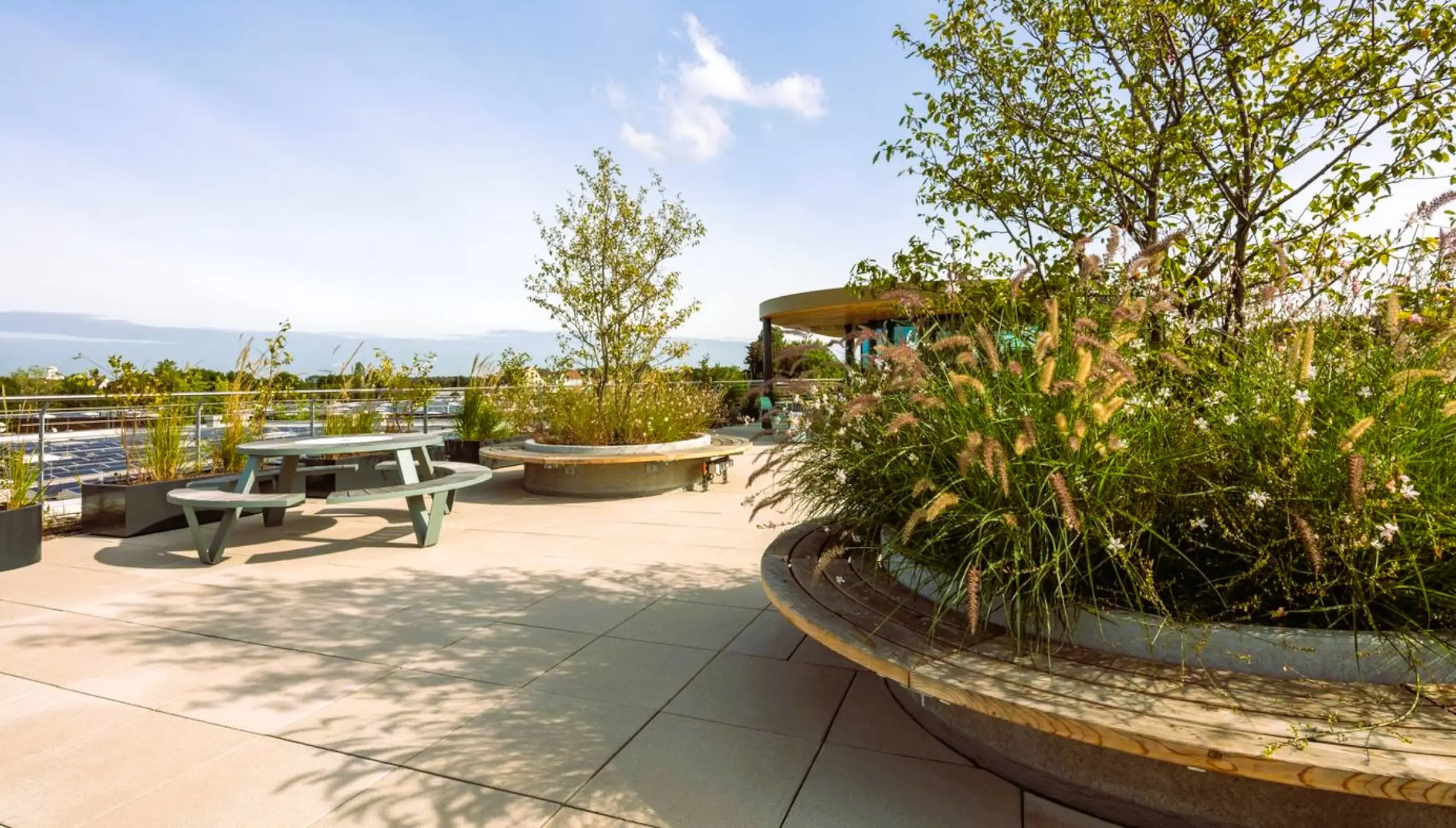 Am „Deck des Schiffes“ befindet sich eine herausragende Attraktion für die Mitarbeitenden: Eine Dachterrasse wie auf dem Sonnendeck eines Kreuzfahrtschiffes. Die Idee und das Ziel war es, mehr als nur eine grüne Dekoration zu schaffen – es sollte eine lebendige Oase entstehen, die sich mit den Jahreszeiten wandelt.
